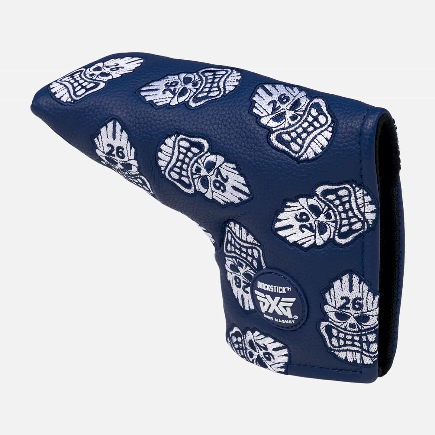 It’s easy to relax on the green when you’ve got our Darkness Tiki Skull Blade. Designed with our Darkness Tiki print embroidered in navy and white, it’s made with a durable polyurethane exterior and plush velour interior to protect your putter from scratches. An interior QuickStick™ cart magnet secures it to your golf cart when not in use.